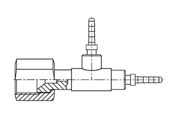Adapteris – „L“ formos trišakis su įvorėmis termoplastinei žarnelei FR 5 DN2 (1/12″), su vidine UNF sriege, SAE tipo, 45° kūgiu. Antgalio medžiaga: žalvaris. Įvorės medžiaga: žalvaris.