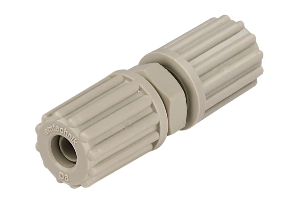 Tiesus žarnos jungtis, 1D serija, EM tipas, plačiai naudojama laboratorijose, medicinoje, farmacijos, chemijos ir maisto pramonėje. Skirta lanksčioms PFA žarnoms, kurių galus montuojant reikia termiškai išplėsti (vadinamasis išplėstas sujungimas). Toks sprendimas užtikrina, kad nesikauptų dalelės, nesidaugintų bakterijos ir būtų pašalinta terpės nuotėkio rizika. Medžiaga: polipropilenas, PVDF. Darbinis slėgis: 10 bar.