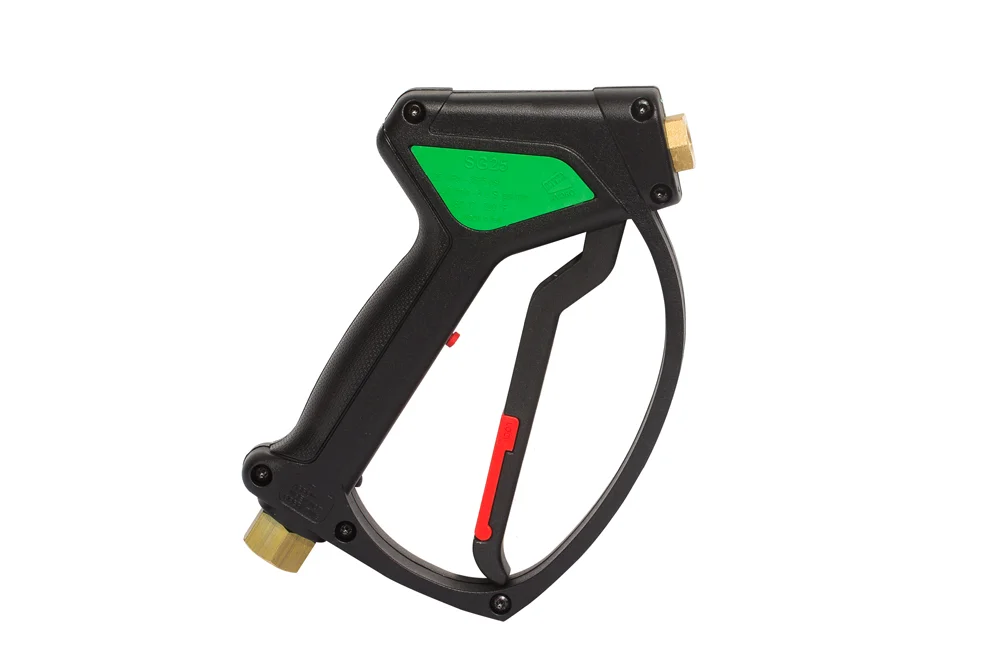 Nesužąlantis aukšto slėgio vandens pistoletas SG25 AF LP pramoniniam naudojimui. Tinka karštam ir šaltam vandeniui. Svirties mechanizmui nereikia didelės operatoriaus jėgos, todėl darbas yra patogus ir malonus. Išleidimo dalis su vidiniu 1/4″ BSP sriegiu. Pistoletas taip pat galimas su besisukančia jungtimi prie sistemos. Korpuso medžiaga: didelio stiprumo plastikas. Darbinis slėgis: iki 220 bar. Leistinas slėgis: 250 bar. Srautas: 30 l/min. Nuotėkis tik esant mažesniam nei 10 bar slėgiui. Darbinė temperatūra: iki +160 °C.