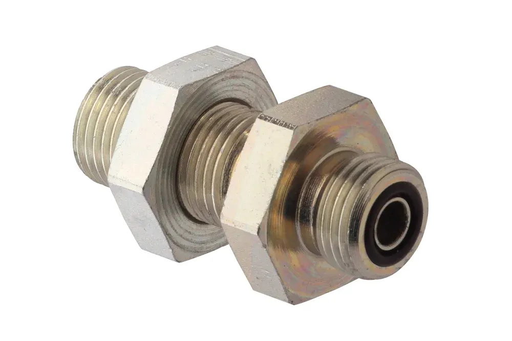 Tiesi pervoraktė ORFS pertvarinė jungtis su išoriniu UNF sriegiu (sandarinimas O-žiedu plokščiojo paviršiaus griovelyje), tipas SV. Medžiaga: anglinis plienas, cinkuotas.